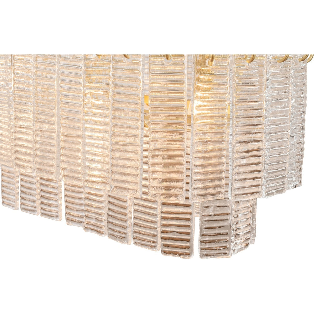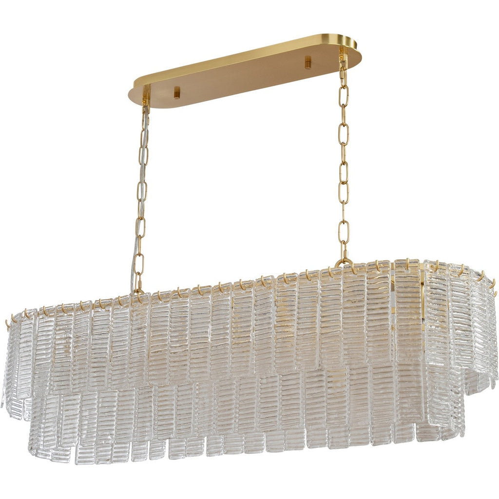 - The Alara 5 Light Bench Chandelier in Satin Brass by Lighting Inspirations draws from the elegance of Italian mid-century design. The layered tiers of textured glass panels create a radiant display of light that enhances any interior.