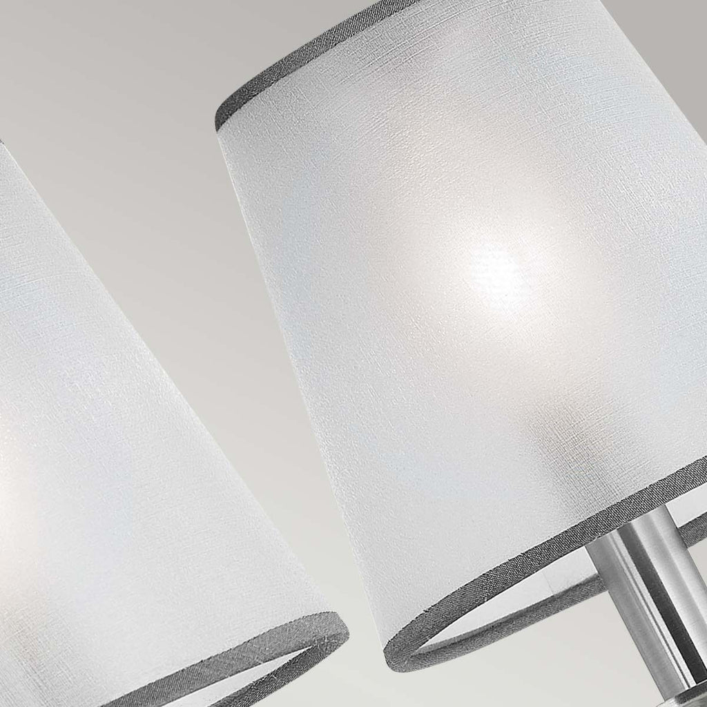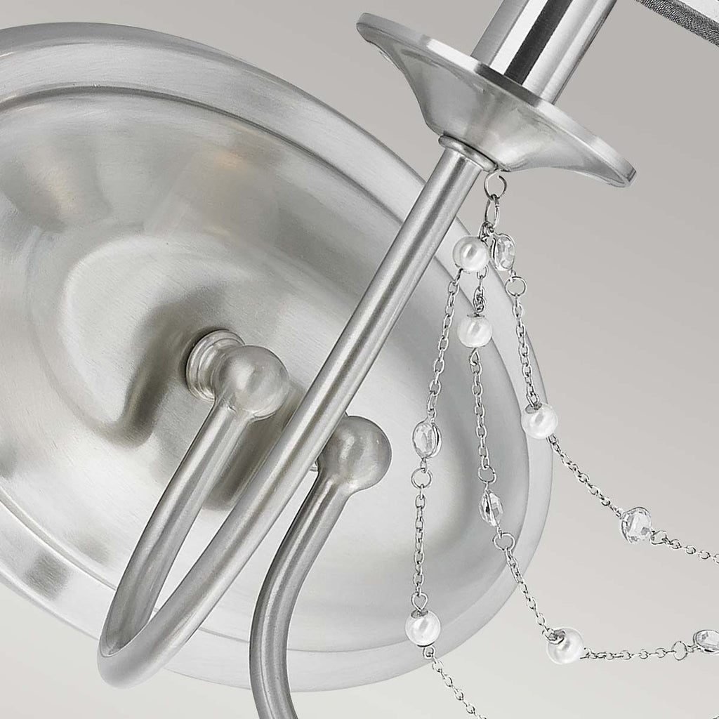 The Aveline 2 Light Wall Light in Brushed Steel by Elstead Lighting captures the romance of bridal jewelry with delicate draped chains adorned with crystals and ghost pearls. Its traditional silhouette is elevated by luxurious organza shades with refined grey trim.