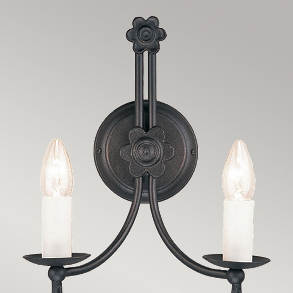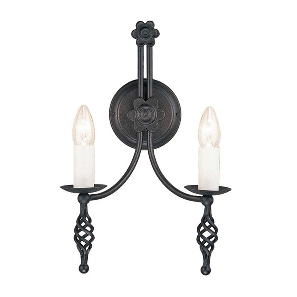 The Belfry Steel 2 Light Wall Light in Black, designed by Elstead Lighting, features a truly medieval design with hand-crafted metalwork, exuding timeless elegance.