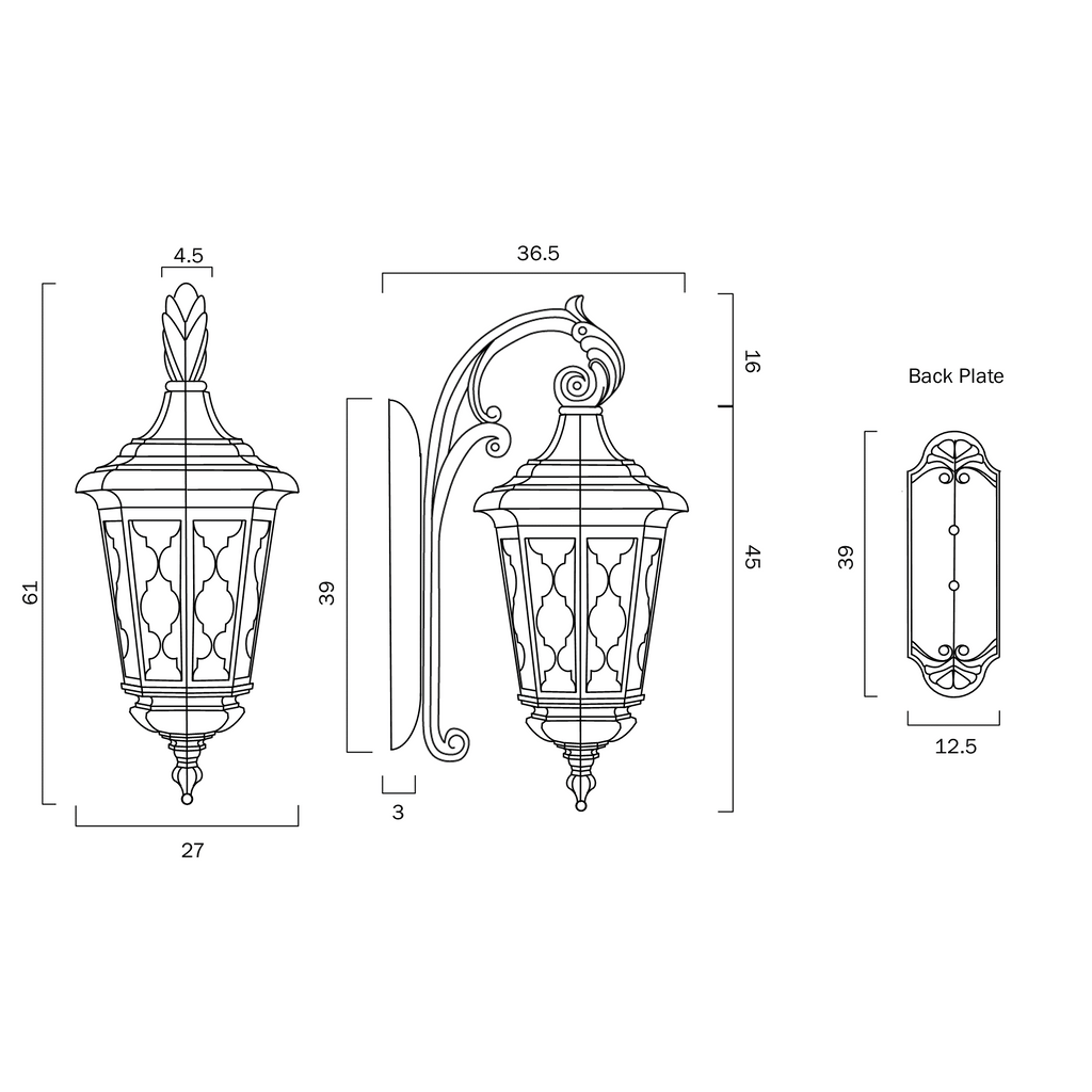 - Featuring a boldly scrolled cast arm and caged lacework glass panels.