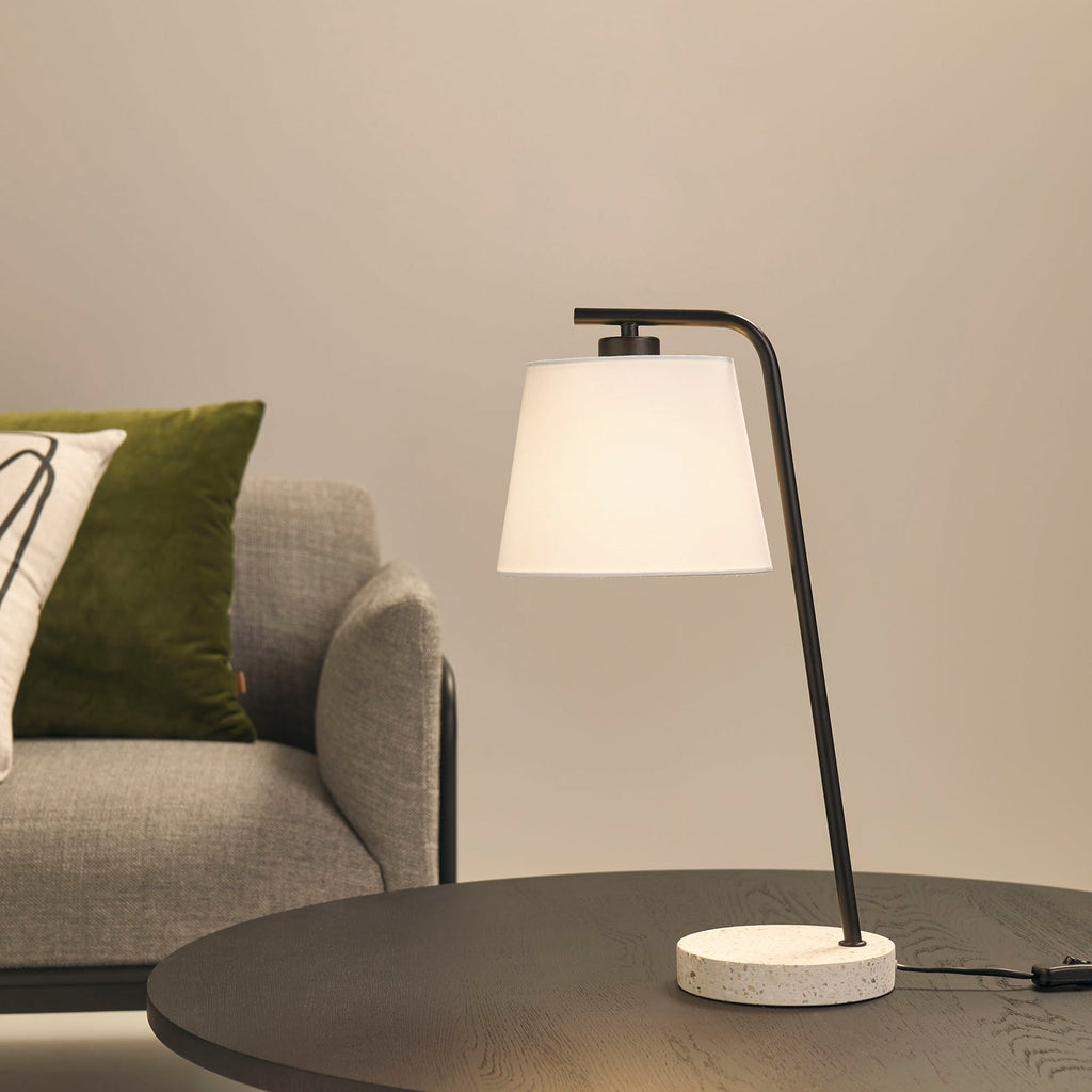 - The Checo Desk Lamp in terrazzo and satin black by Mayfield features a terrazzo base with refined metallic accents and a 20cm white shade. Its clean, contemporary design makes it a stylish addition to desks, study areas, or home offices, while providing focused task lighting.
