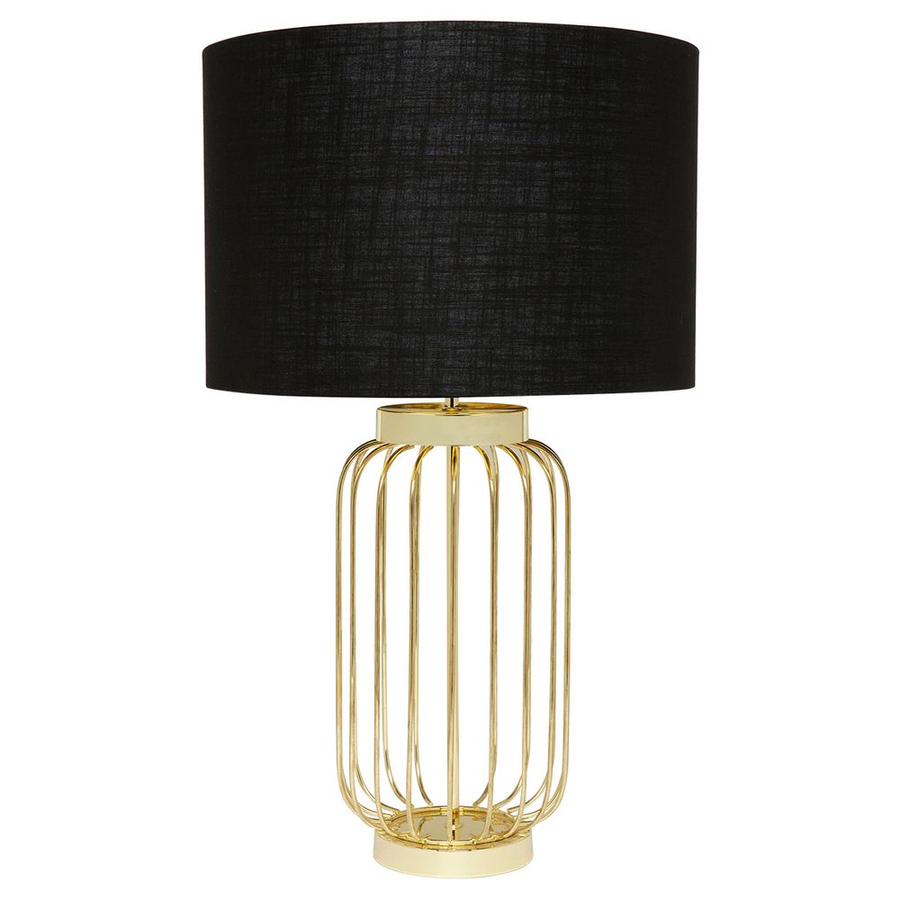 Cleo Floor Lamp gold base with black shade by Café Lighting & Living brings a bold blend of luxe style and industrial edge to your space. Featuring a striking gold metal wire base and a black linen drum shade lined with gold, it casts a warm, ambient glow that enhances any room.