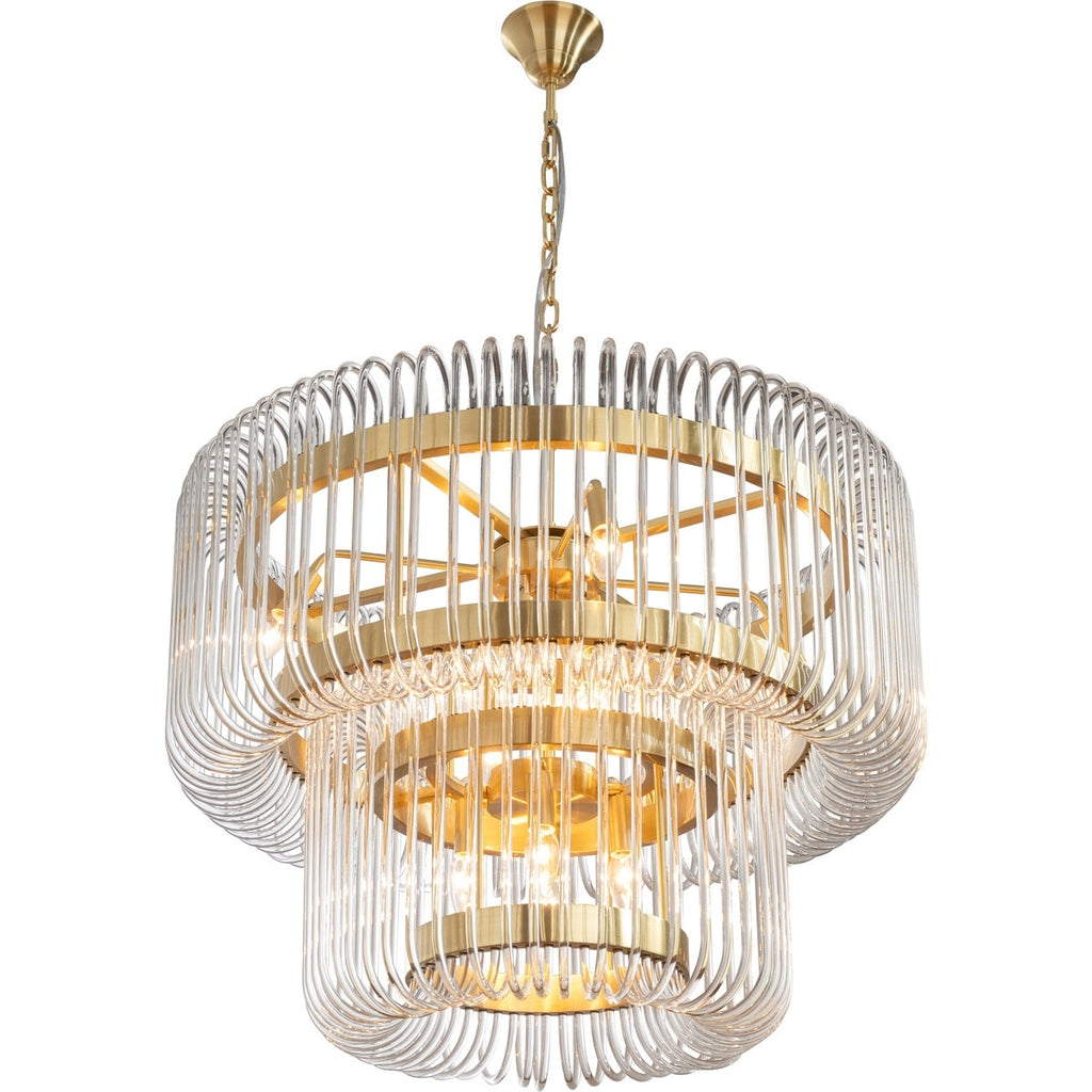 - The Collete 13 Light 2 Tier Chandelier in Satin Brass by Lighting Inspirations is bold, sophisticated, and visually captivating. The sleek metalware pairs beautifully with cascades of clear glass rods, creating a dazzling effect in any room.