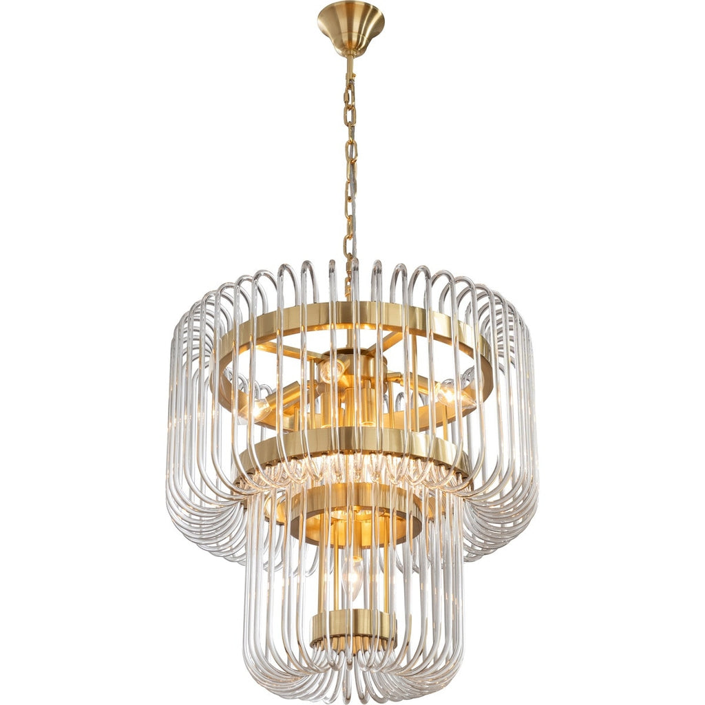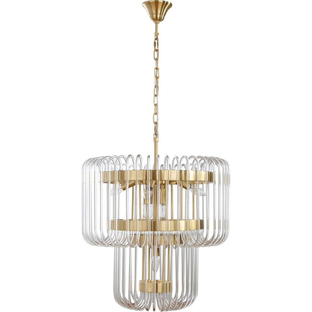 - The Collete 9 Light 2 Tier Chandelier in Satin Brass by Lighting Inspirations is bold, sophisticated, and visually captivating. The sleek metalware pairs beautifully with cascades of clear glass rods, creating a dazzling effect in any room.