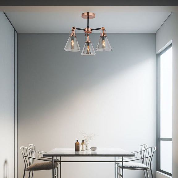 - The Conea Semi Flush Mount Light in Antique Copper and Smoky by Lexi Lighting features a sleek, modern design that combines metal and glass for a warm, ambient glow. The subtle smoky detailing enhances its elegant appearance, making it perfect for living rooms, hallways, or bedrooms.