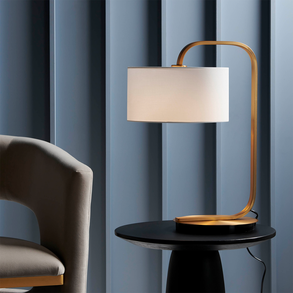 - The Cordell Table Lamp in Satin Brass & white by Mayfield Lighting features a striking two-tone design that pairs bold Satin Brass elements with crisp white accents for a modern, graphic look. Its sleek silhouette provides soft ambient illumination ideal for bedside tables, desks, or living spaces.