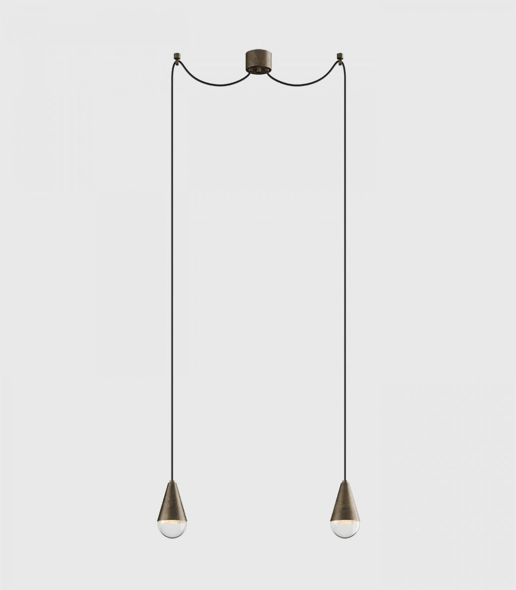 - The Dew Double Pendant Light in Iron by IL Fanale Lighting showcases a paired pendant design that blends industrial refinement with contemporary elegance. The dual configuration provides balanced illumination ideal for kitchen benches, dining areas, or intimate seating spaces.