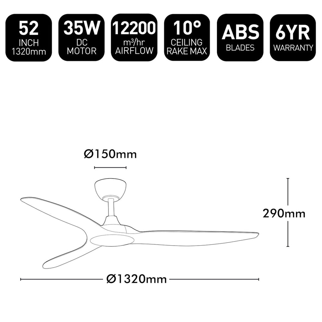 - The Fantastic DC Ceiling Fan 52" in White features a sleek three-blade design with a slim, compact DC motor and aerodynamic blades that deliver quiet, efficient airflow. Designed for small to medium-sized spaces, it includes a feature-packed remote control for total convenience and customisation.