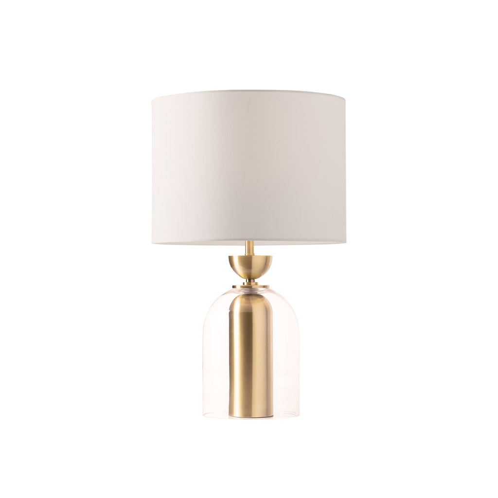 - The Martha Table Lamp in Antique Brass by Mayfield features a refined satin brass and glass base paired with a 35 cm off-white shade. Its elegant combination of warm metallic tones and soft fabric creates a timeless look while providing gentle, ambient illumination.