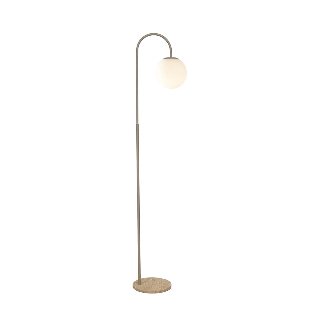 The Mintu Floor Lamp in taupe & travertine by Mayfield Lighting features a soft, contemporary colour palette paired with the natural texture of travertine stone. Its elegant design provides focused task lighting, making it ideal for desks, bedside tables, or study spaces.