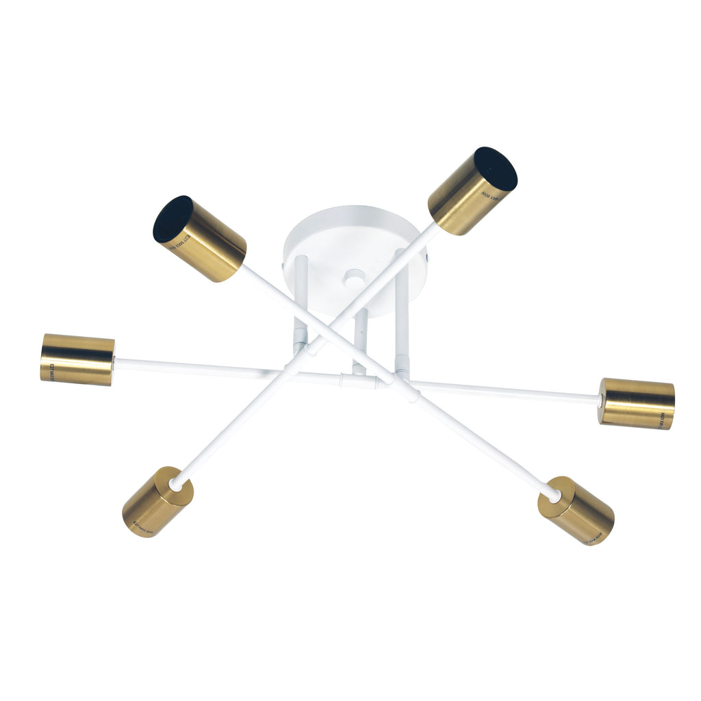 - The Muna 6 Light Semi Flush Mount Light in Satin Brass & White offers a perfect balance of style and function, ideal for living and dining rooms with low ceilings. Featuring satin brass lamp holders and a sleek white frame with a central swivel joint, it delivers a refined aesthetic with a hint of mid-century flair.