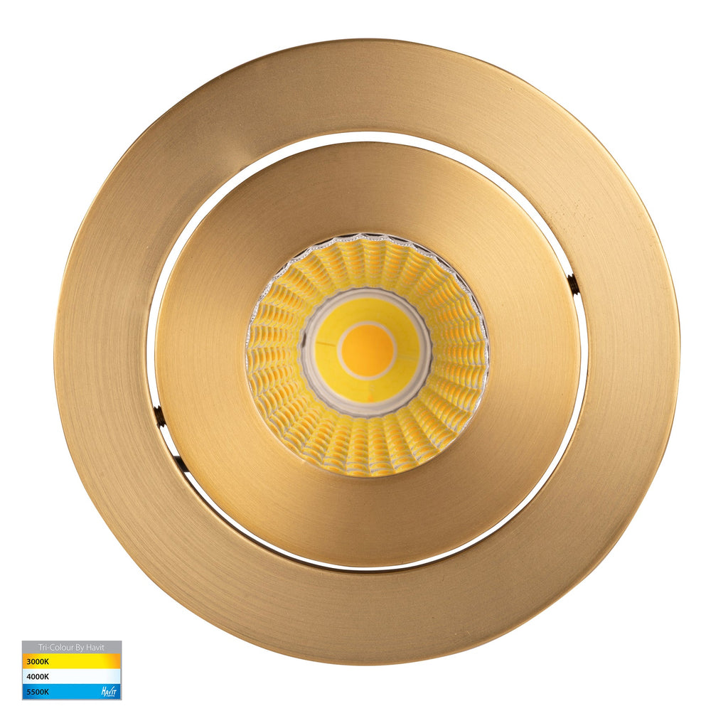 - The Prime Tilt LED Downlight 12W Tri Colour in Brass by Havit Lighting offers a refined lighting solution that blends classic elegance with modern performance. Featuring a stylish brass finish, it adds warmth and character to interiors while delivering efficient illumination.