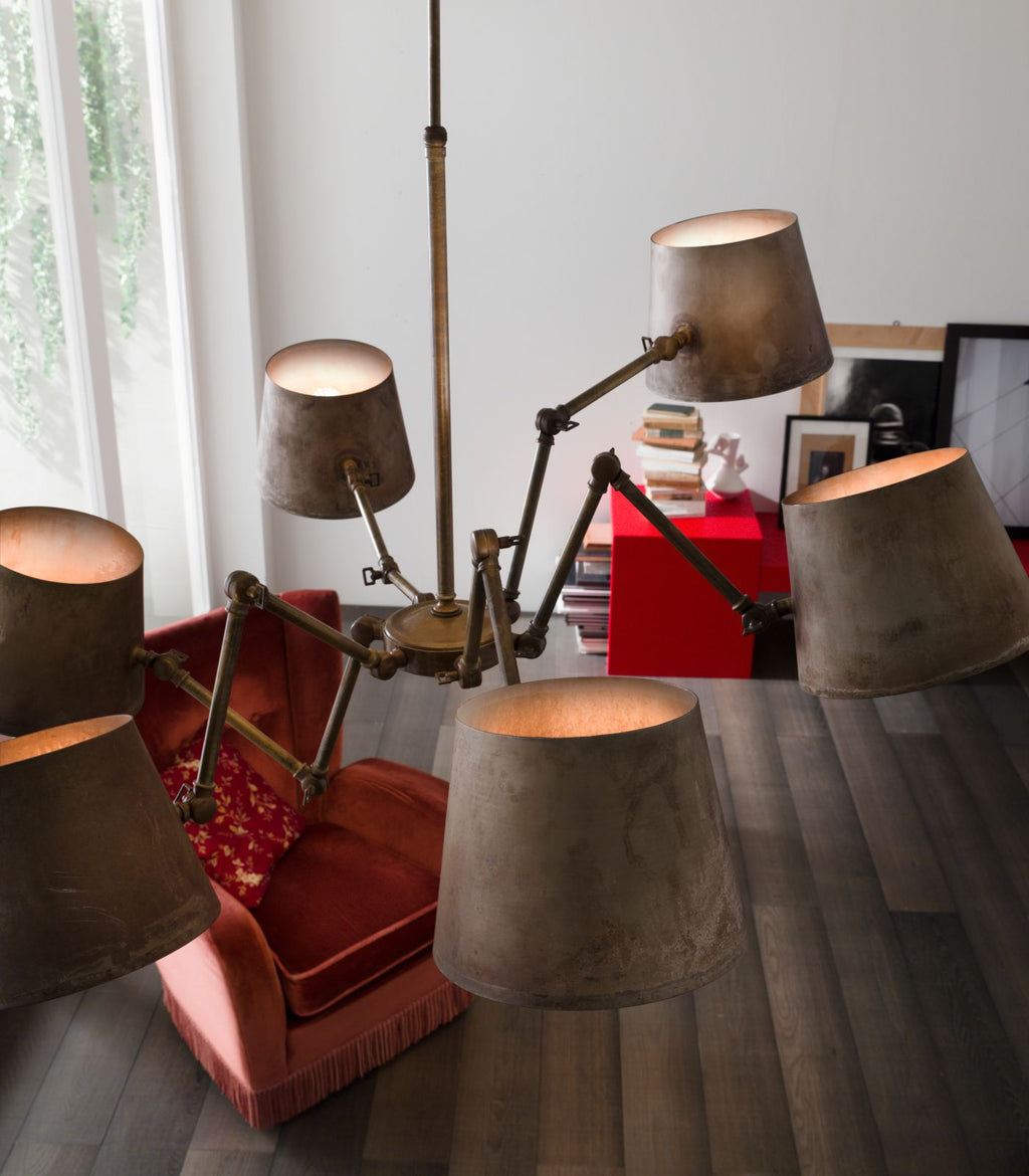 - The Reporter Adjustable Chandelier in Pre Aged by IL Fanale Lighting combines vintage-industrial charm with flexible, functional lighting for modern interiors. The adjustable arms allow customization of light direction and layout, making it ideal for dining rooms, kitchens, or entryways with variable ceiling heights.
