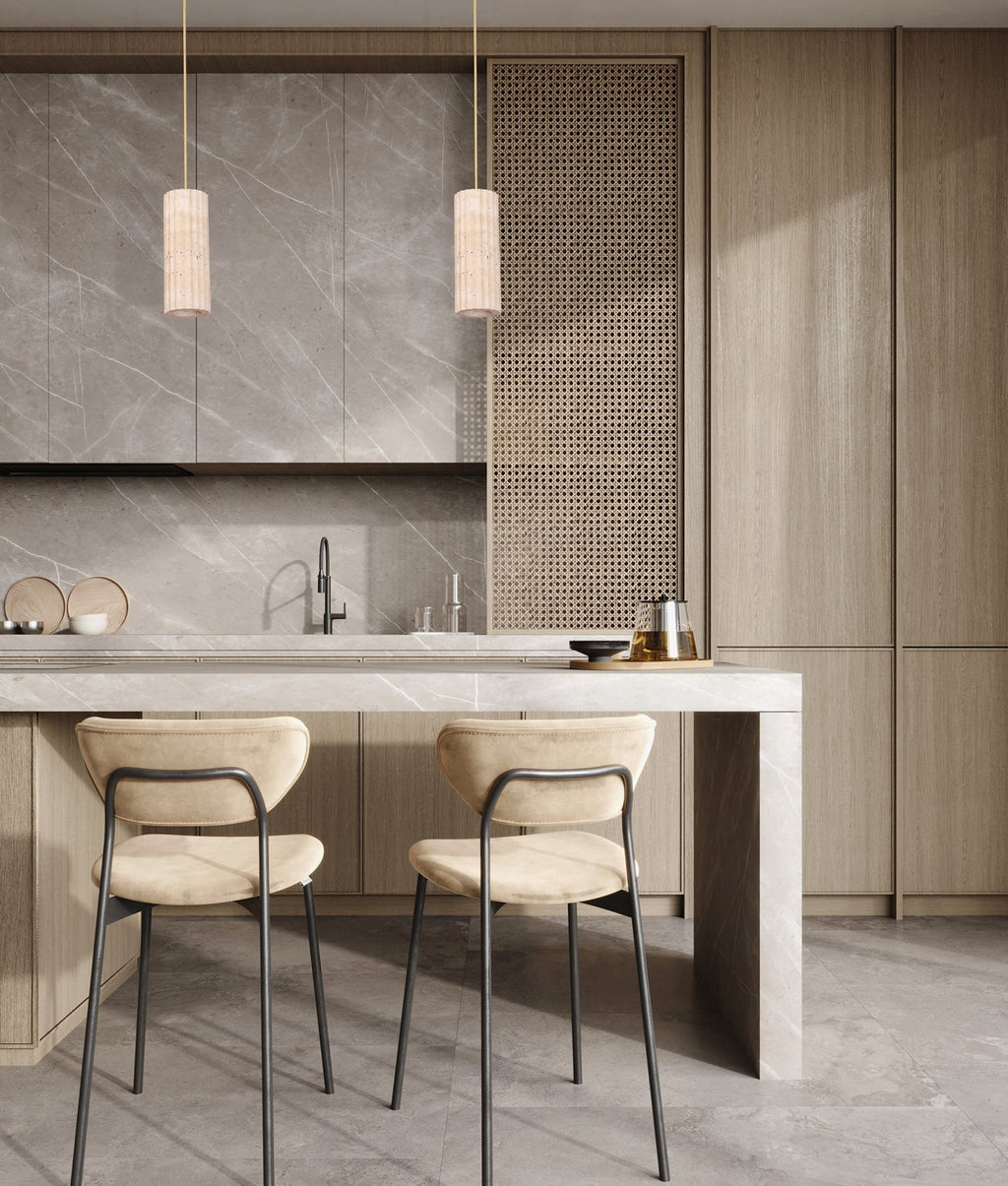 - Sagitta Oblong Pendant Light Beige & Brass features a refined oblong design crafted with a beige travertine body complemented by elegant brass highlights. Ideal for adding a warm and sophisticated touch to dining areas, kitchen islands, or living spaces, this pendant light blends natural textures with modern aesthetics.