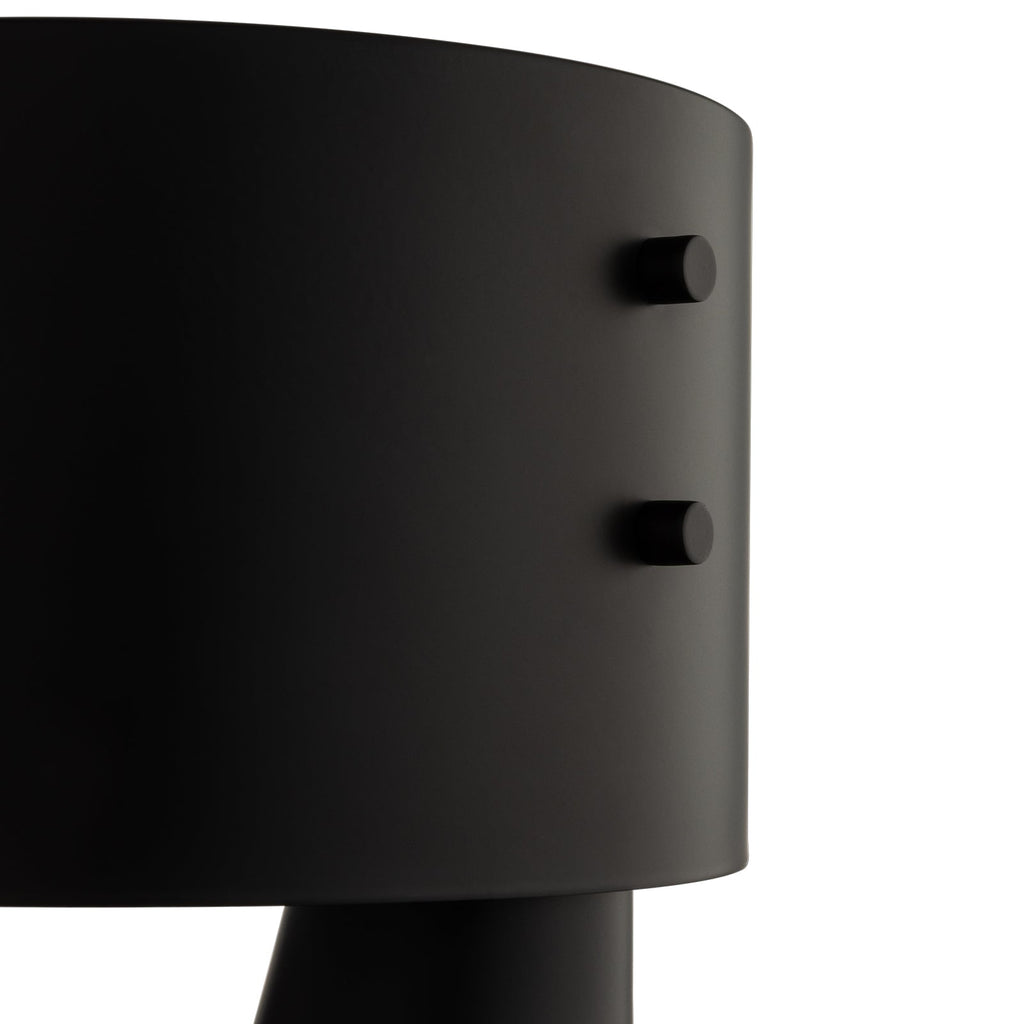 - The Zentra Table Lamp in Satin Black by Mayfield features a striking architectural silhouette, with a tilted conical base supporting a wide cylindrical shade for a bold interplay of balance and geometry.